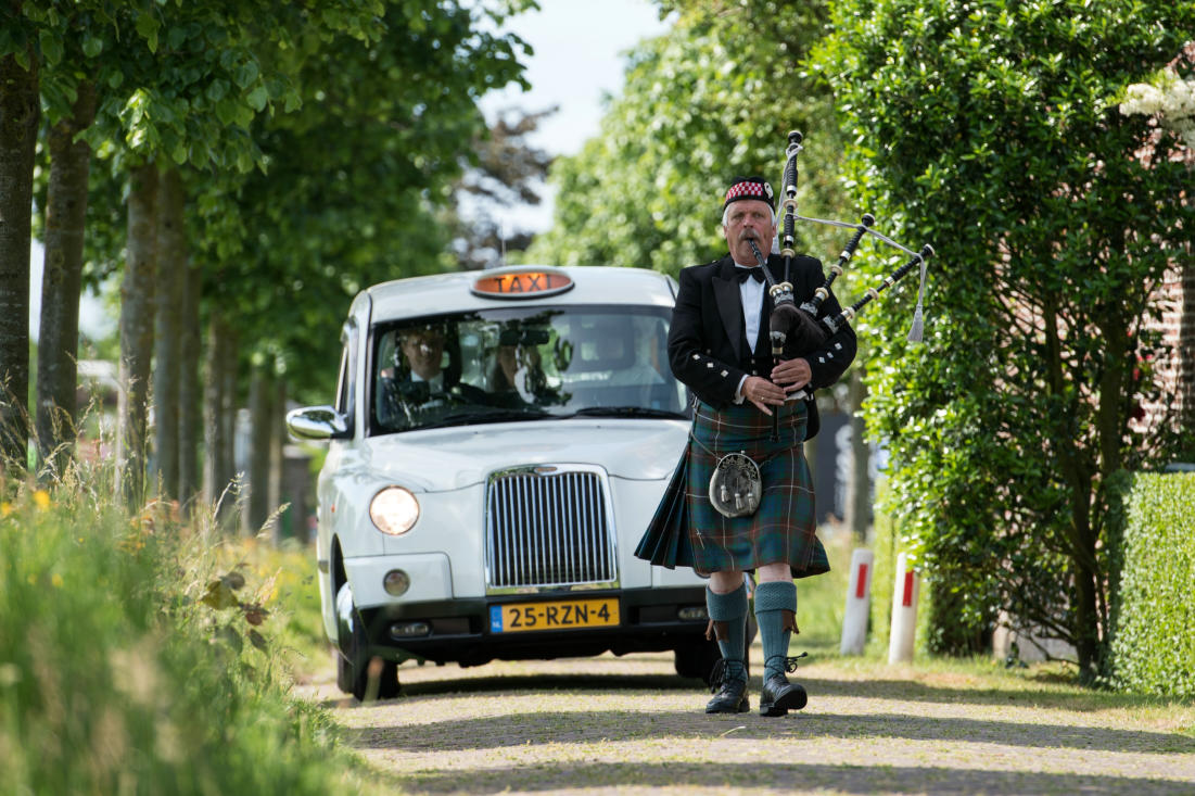voor de trouwauto uit. Deze witte Engelse taxi was