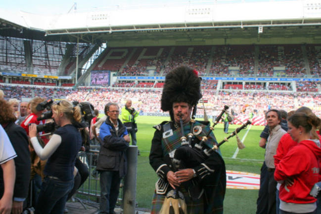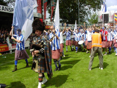 Celebration after the football club ‘Katwijkse Quick Boys’ had won the Dutch Football Championships. This club had won thanks to their enthusiastic supporters club and the encouraging sounds of the Scottish bagpipes.