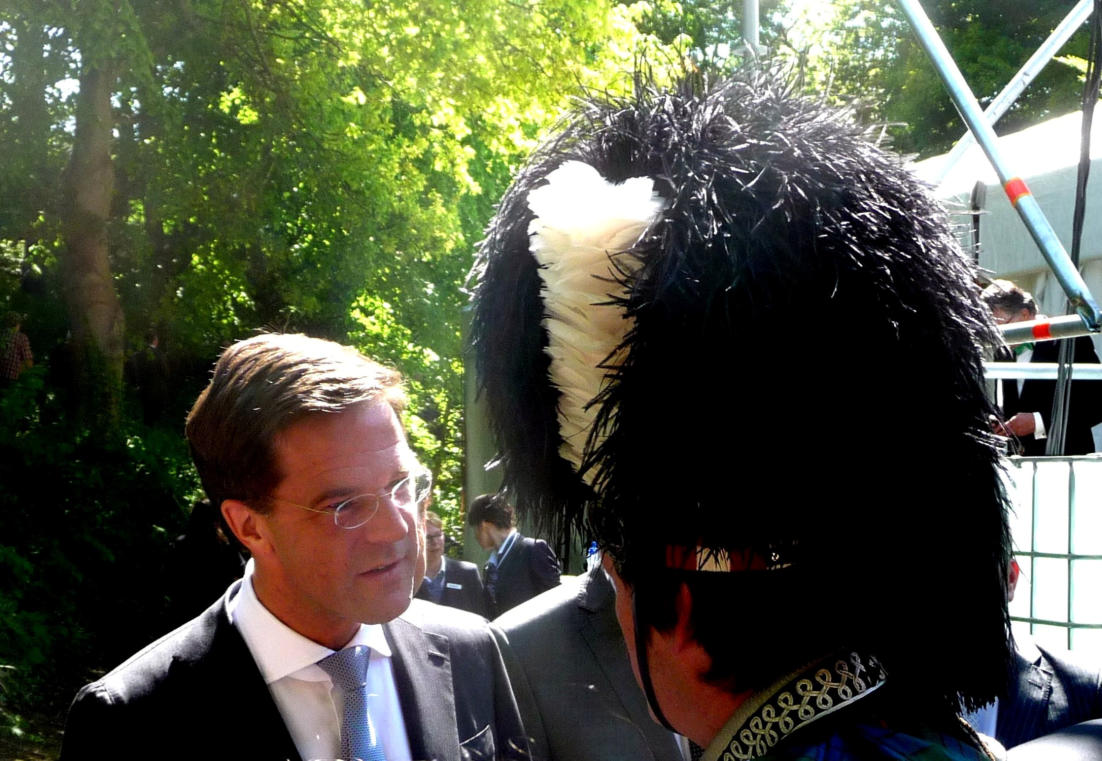 Talking to former Prime Minister Mark Rutte. Getting compliments after he just heard me playing the pipes.