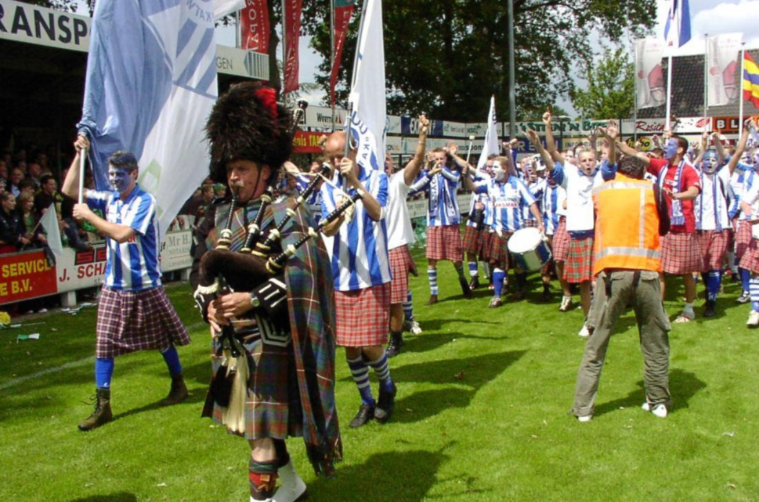 Celebration after the football club ‘Katwijkse Quick Boys’ had won the Dutch Football Championships. This club had won thanks to their enthusiastic supporters club and the encouraging sounds of the Scottish bagpipes.