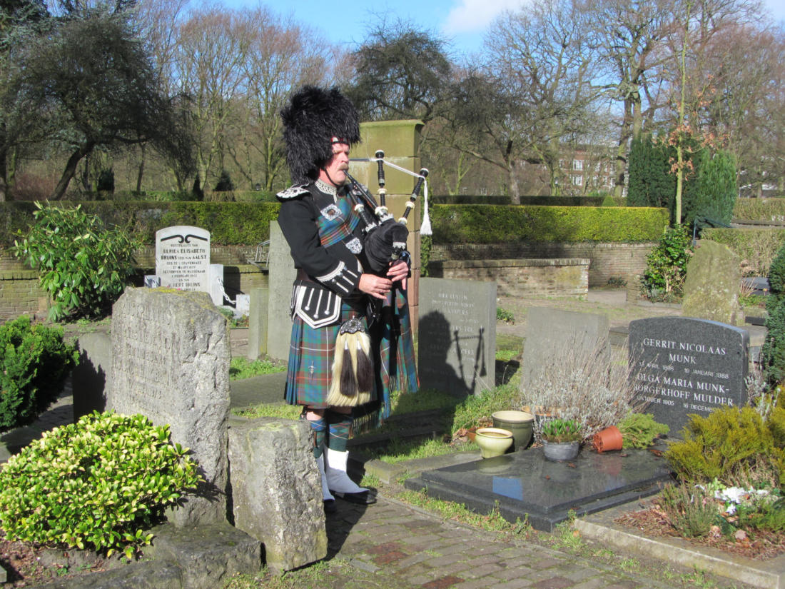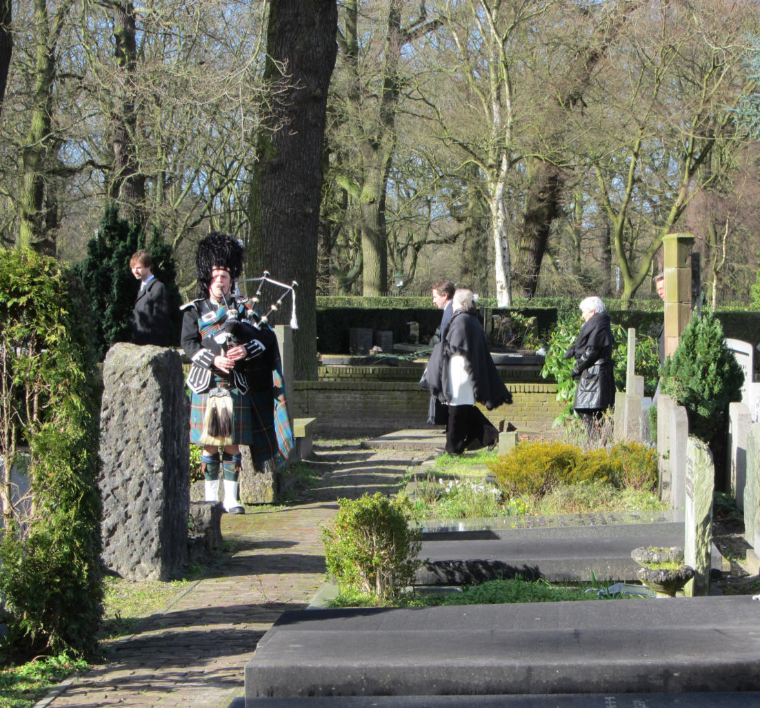 Playing ‘When the Battle is Over’ at arrival Schiedam crematorium: A very nice tune is ‘Iain Ruaidh’s Lament’: Retreat march ‘Kilworth Hills’ at the New Eastern Cemetery, Amsterdam: