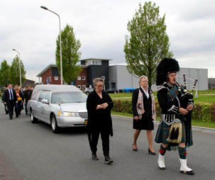 Crematie Uden Wat heb ik in mijn rats gezeten die maandag de 15de februari. Code rood! En ‘mijn’ doedelzakspeler moest een heel eind reizen, maar hij deed het! Wat een verrassing voor achterblijver Ruud, die afscheid moest nemen van zijn geliefde man Aad. Samen hadden zij zulke mooie herinneringen aan Schotland en de bagpipes….Hij had er helemaal niet meer op gerekend dat je zou komen. Dank Gareth voor je prachtige spel, waardoor de familie, zowel ik enorm geraakt werden… Mw. Freddy van Eerd, Tempus Uitvaartzorg, Oss