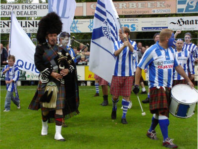 Feest nadat de voetbal club, de ‘Katwijkse Boys’ het Nederlands Voetbal Kampioenschap Amateurs had gewonnen.Deze club had gewonnen dankzij hun enthousiaste supportersclub en de aanmoedigende klanken van de Schotse doedelzak.